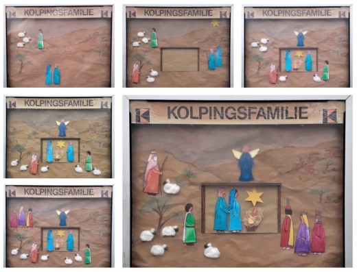 Landschaft mit einem Dorf auf der Anhöhe, gestaltet von einer Kolpingschwester, diente als Kulisse. Zuerst zog Josef mit Maria Richtung Bethlehem. Doch im Dorf